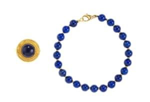 L'une à décor de granulation sertie d'un lapis-lazuli taille cab...