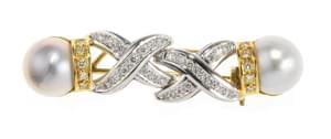 3344. Broche-barrette sertie de deux perles mabé et pavée de diamants