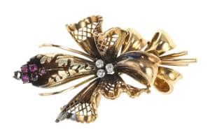 3318. Broche à motif de bouquet aux feuilles émaillées vertes et serti...