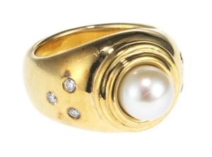 3385. Bague sertie d'une perle (D env. 7,5 mm) épaulée de diamants