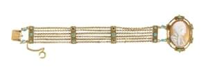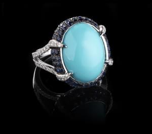 Ponctué de barrettes ciselées serties de turquoises taille caboc...