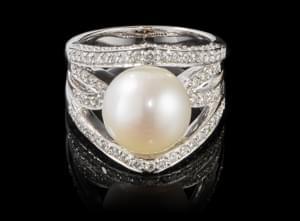 3413. Bague design sertie d'une perle (D env. 10 mm) rehaussée de diam...