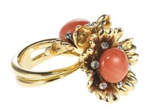 3419. Bague formée d'un motif de deux fleurs mobiles centrées d'un cor...