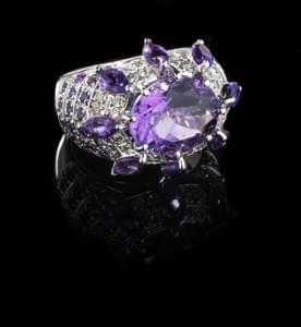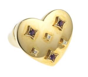 3432. Bague à motif de cœur serti de trois diamants et de trois améthy...