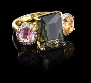 Epaulée de deux saphirs taille ovale, l'un rose et l'autre jaune...