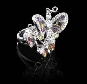3444. *Bague figurant trois papillons aux ailes pavées de pierres fine...