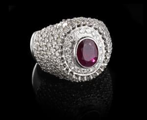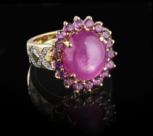3462. *Bague sertie d'un rubis taille cabochon (env. 11 ct) entouré de...