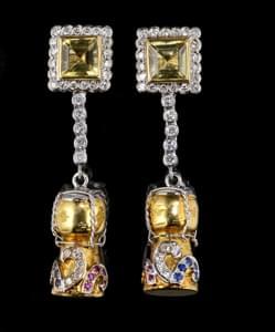 3464. *Pendants d'oreilles sertis de beryls jaunes taille carrée entou...