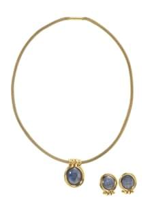 3468. Lot d'un collier et de clips d'oreilles sertis de plaques de sap...