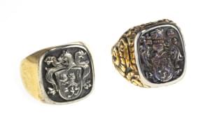 3470. Lot de deux chevalières à décor d'armoiries, l'une signée Carl B...