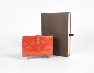 Cuir monogrammé vernis rouge, rabat frontal avec un bouton-press...