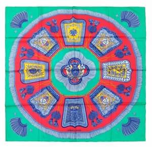A décor de blasons sur fond rouge, bleu et vert, soie, 90x90 cm