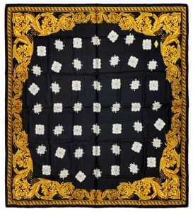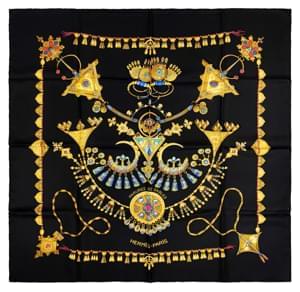 A décor de bijoux sur fond noir et doré, soie, 90x87 cm