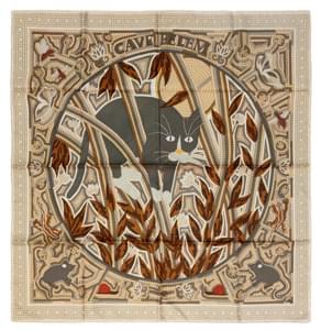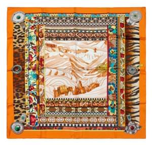 A décor de mors et blasons sur fond marron, camel et blanc, soie...