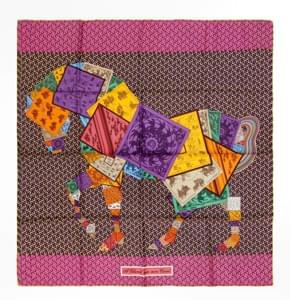 A décor de fers à cheval, de cavaliers sur fond polychrome, soie...