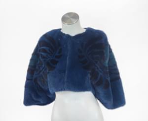 Vison teinté bleu à motif de plumes de paon vert et noir, fermet...