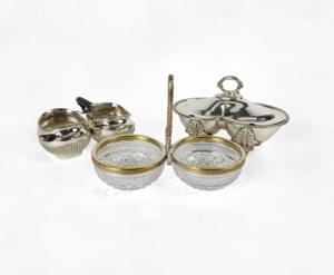 Londres, argent, verre et acajou, comprenant: plateau rond, deux...
