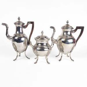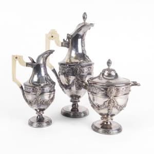 3733. Deux verseuses et un sucrier à décor de têtes de bélier et guirl...