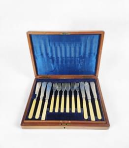 Angleterre, métal argenté et ivoire dans un coffret en bois natu...