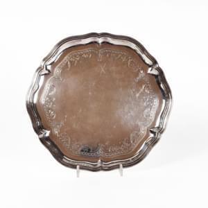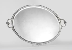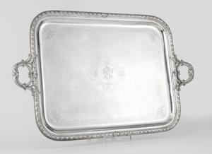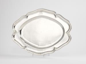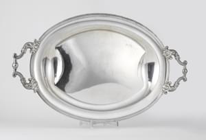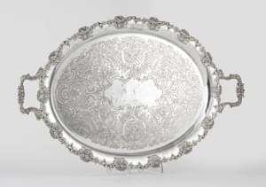 3744. Plateau de service ovale gravé de rinceaux et à bordure de pampr...