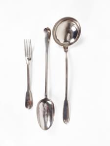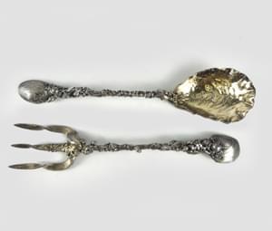 3752. Une cuillère à ragoût armoriée, une fourchette de service et une...