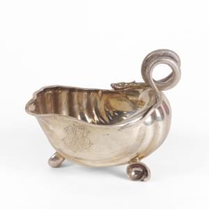 3817. Saucière tripode en forme de coquillage à anse serpent