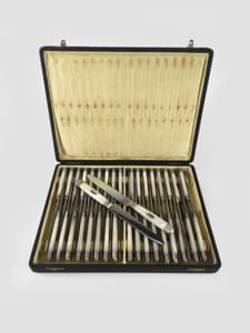 3830. Suite de 36 couteaux à manche en nacre bagués d'argent.