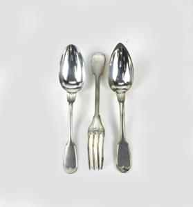 3870. Ensemble de 12 fourchettes et 35 cuillères, modèle filet françai...