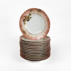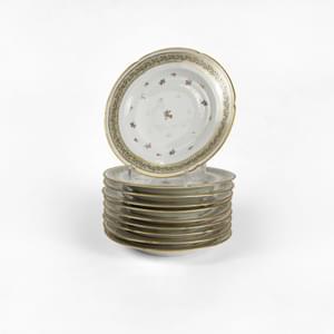 3872. Suite de 12 assiettes à bordure de palmettes et monogramme