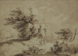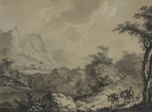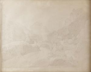 Paysage de ruines animé, mine de plomb et aquarelle sur papier,...