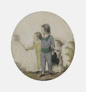 Trois enfants, crayon et aquarelle en tondo sur papier, 32x30 cm
