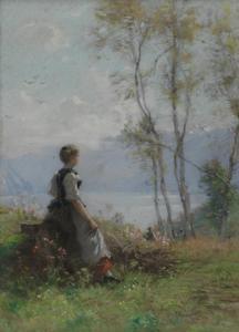 Jeune femme en costume au bord du lac, pastel sur papier, signé,...