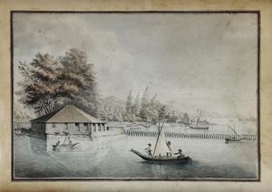 Arbre sur une rivière, fusain et gouache sur papier, signé et da...