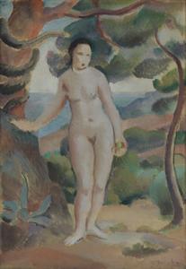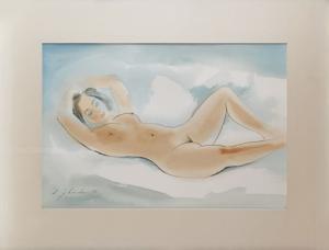 Femme brune nue allongée, aquarelle sur papier, signée et datée...