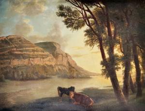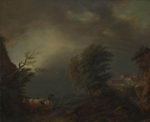 Paysage pastoral animé aux monuments antiques, huile sur toile,...