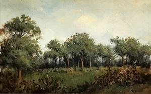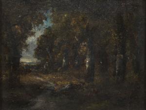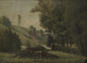 Promeneuse dans les bois au bord de la rivière, huile sur carton...
