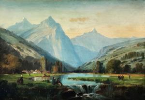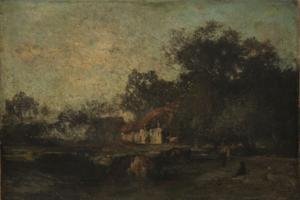 Paysage animé avec une rivière, huile sur toile, 38x50 cm