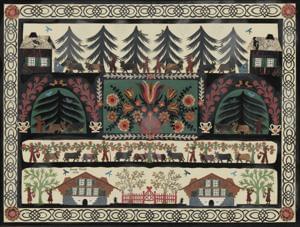 Découpage, poya et chalets, signé et daté 1976, 25x33 cm