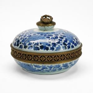 Porcelaine émaillée bleu blanc à décor de pivoines, monture en b...