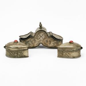 Bois sculpté et incrusté de nacre, gravé de décors géométriques,...
