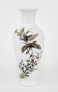 Porcelaine émaillée à décor d'oiseaux en grisaille, H 36 cm