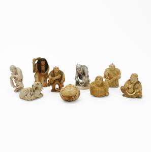 4755. Collection de neuf netsukes avec sujets divers, Japon, XXe s
