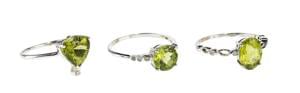 3201. *Lot de trois bagues serties de péridots taille ovale, taille cœ...