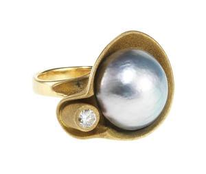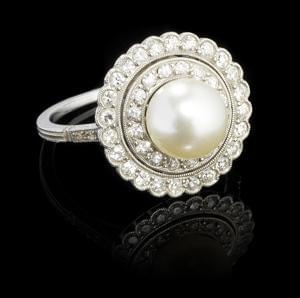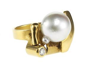 3217. Bague sertie d'une perle blanche (D env. 7,5 mm) dans un double...