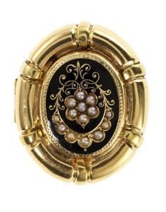 3221. Broche ovale centrée d'un motif ovale émaillé noir serti de demi...
