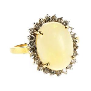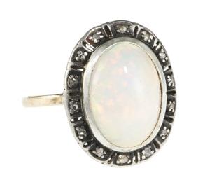3262. Bague sertie d'une opale à fond blanc taille cabochon ovale ento...