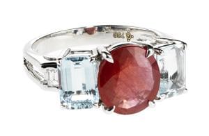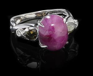 3292. *Bague sertie d'un rubis taille cabochon ovale épaulé de deux di...