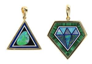 L'un en forme de diamant en marqueterie d'opale sur malachite, l...