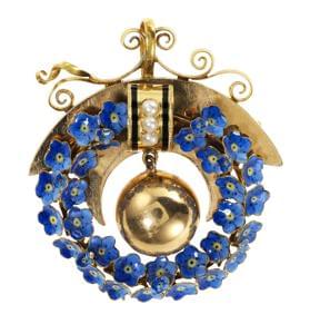 3295. Broche retenant une couronne de myosotis émaillés et rehaussée d...