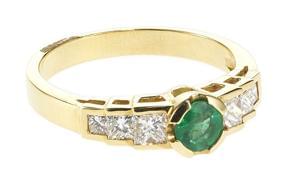 3296. Bague centrée d'une émeraude taille brillant (env. 0,35 ct) épau...